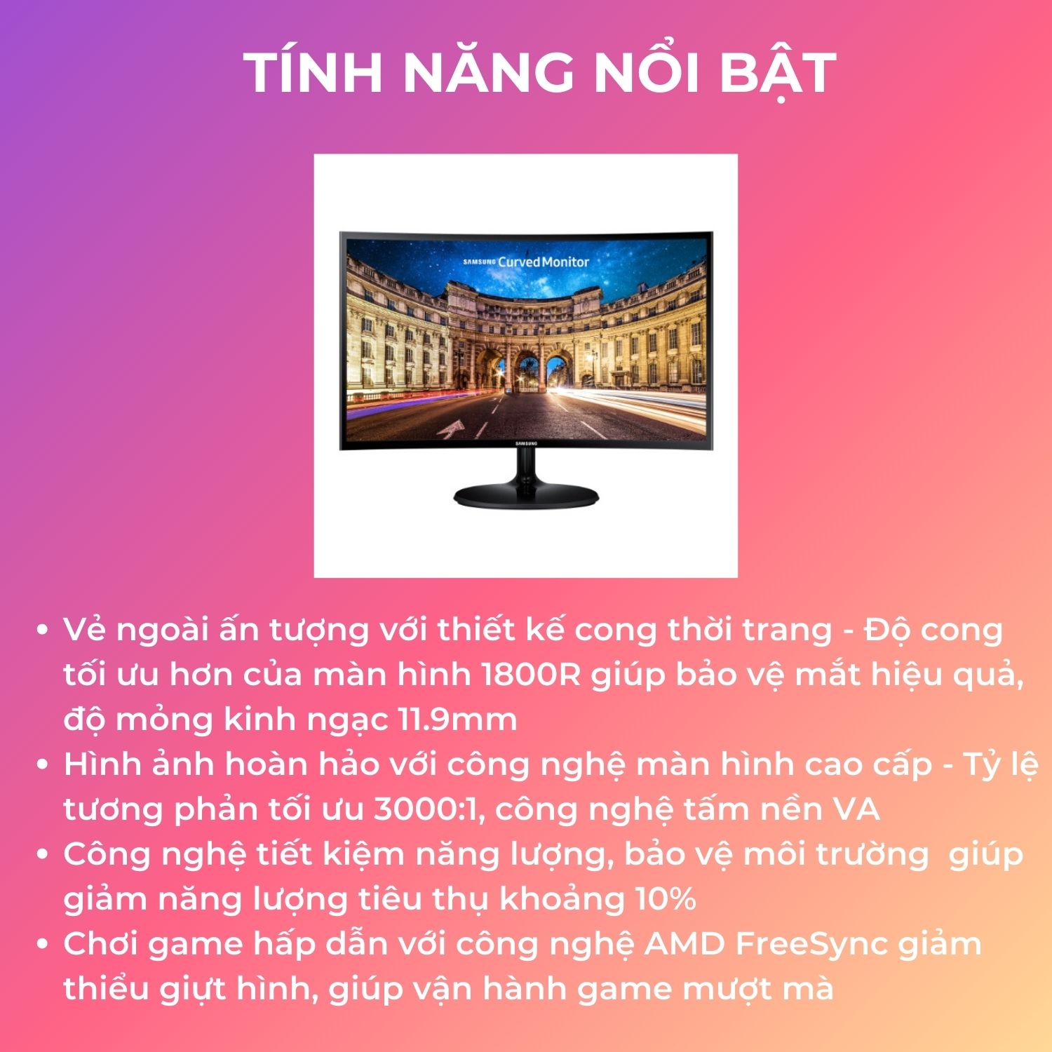Màn hình cong ấn tượng: với độ mỏng kinh ngạc 11.9mm. Chỉ bằng một cây bút bi, độ cong màn hình mỏng hơn màn hình thế hệ trước. Chân đế tối giản: chân đế thanh lịch làm tăng vẻ đẹp của màn hình cong siêu mỏng.